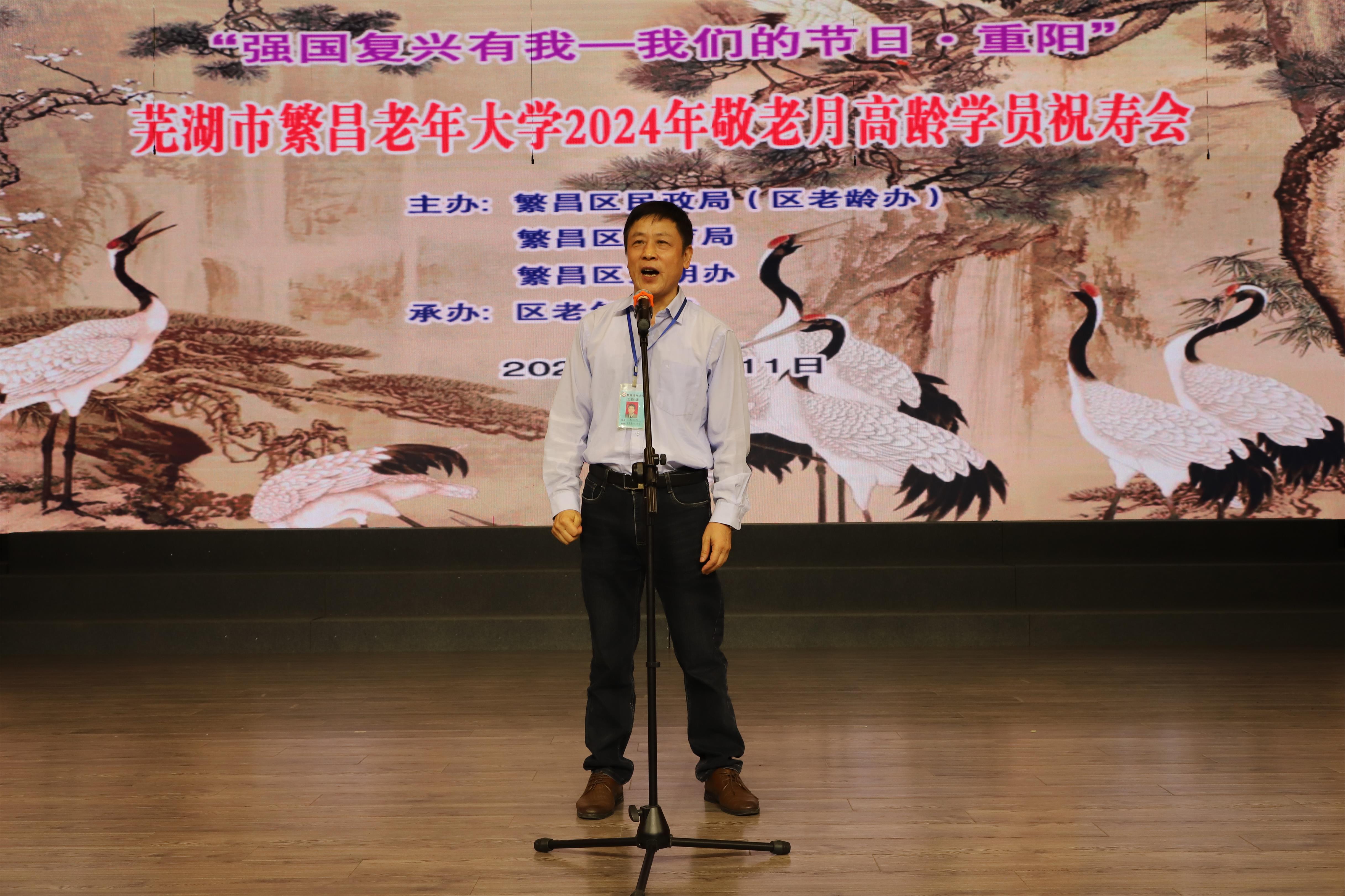 在2024年“敬老月”活动中,10月11日上午,区教育局、区民政局(老龄办)、区文明办主办,区老年大学承办的“2024年区敬老月高龄学员祝寿会”在繁昌老年大学演出大厅隆重举行。祝寿会由区委离退休干部党工委书记、区老教委副主任、区老年大学党委书记、校长朱能雨主持。区委副书记、区委组织部部长、统战部部长邓辉林出席祝寿会并致辞。区领导和出席祝寿会的区有关部门负责人热情为90岁以上的寿星学员披挂寿带。