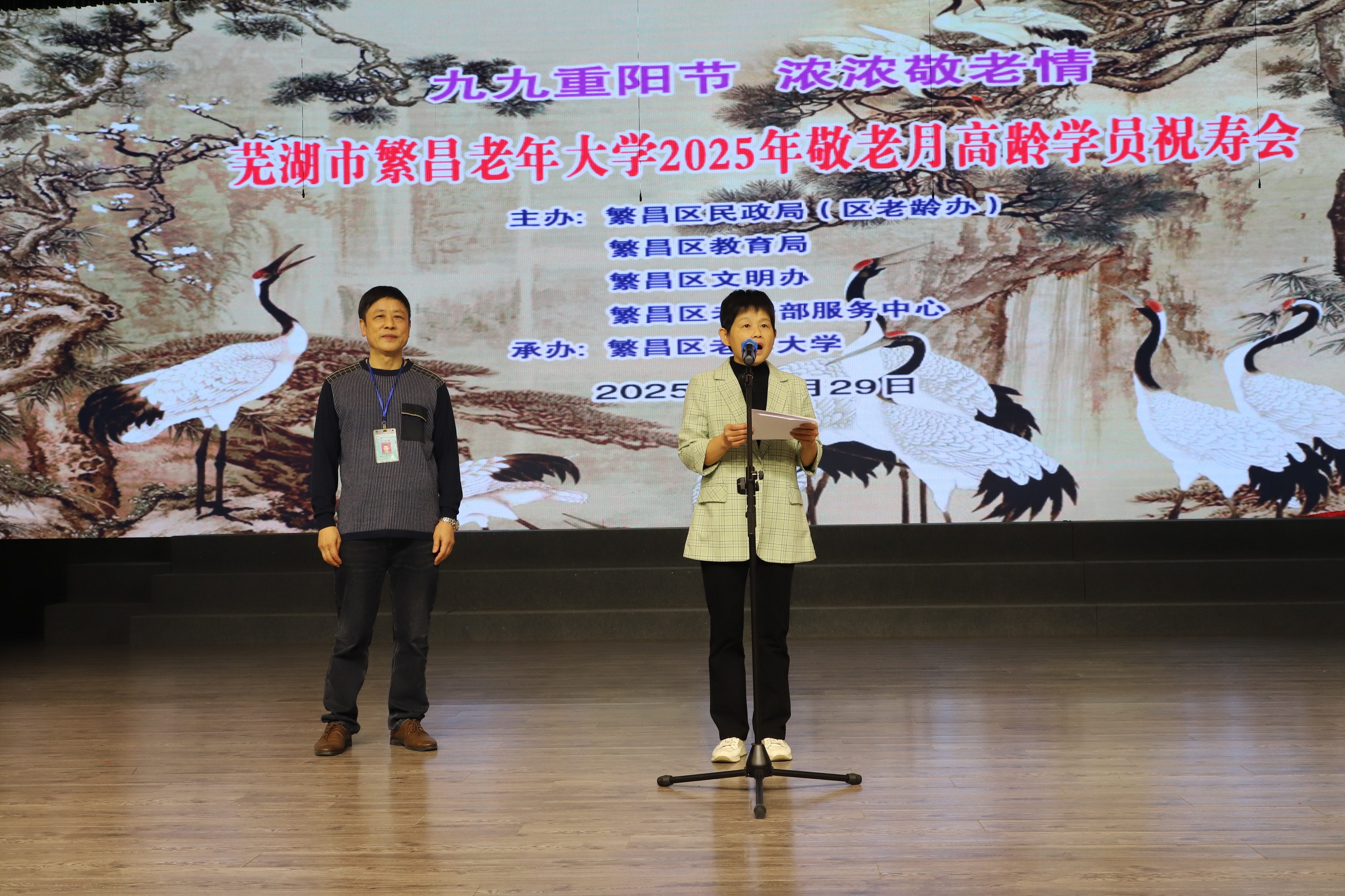 10月29日,正是重阳节。当日上午,由区民政局(老龄办)、区教育局、区文明办、区老干部服务中心主办,繁昌老年大学承办的“2025年敬老月高龄学员祝寿会”在繁昌老年大学演出大厅隆重举行。祝寿会由繁昌老年大学党委书记、校长朱能雨主持。区政协副主席王重娟,区政协副主席、教育局党委书记、局长王心生,区民政局党委书记、局长何元明,区委宣传部副部长、文明办主任汪华锋,区老龄办主任刘天宇等出席祝寿会。区政协副主席王重娟作了热情洋溢的祝寿词。区领导和出席祝寿会的区有关部门负责人热情为90岁以上的寿星学员披挂寿带。
