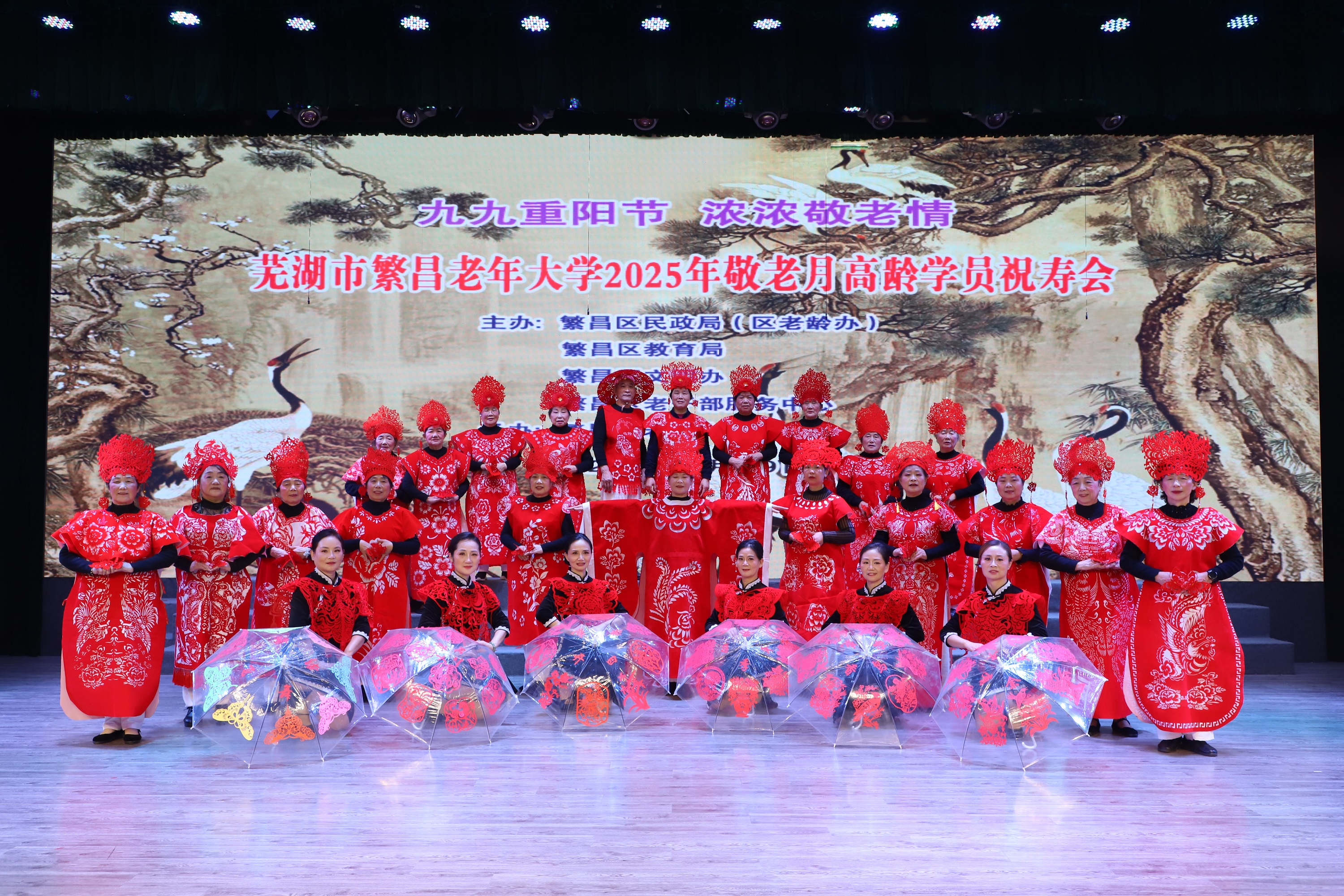 繁昌老年大学剪纸班学员在2025年“重阳节”学校为80岁以上高龄学员举行的祝寿会上奉献的“剪纸秀”节目,引起台下观众阵阵掌声。