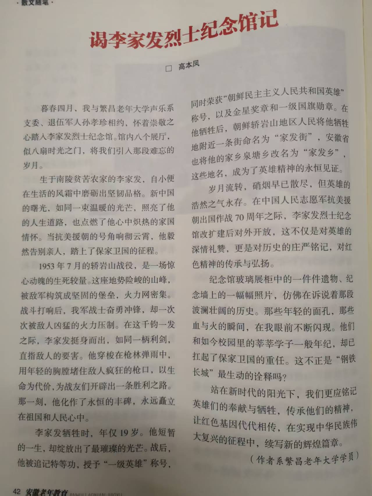 《安徽老年教育》由安徽省委老干部局主管,安徽老年大学(省委老干部活动中心)主办。这是继2024年张诗秀文章和张先勇的图片刊登在《安徽老年教育》2024年双月刊第一期,翟晓玲简讯刊登在第二期,盛茂山的《智能为我减负》文章刊登在《安徽老年教育》第三期上,张诗秀的《发挥银发作用,助力社会发展》文章又刊登《安徽老年教育》2024年双月刊第五期上后,繁昌老年大学高本凤的《谒李家发烈士纪念馆记》文章刊登在日前出版的《安徽老年教育》2025年双月刊第四期上,可喜可贺。