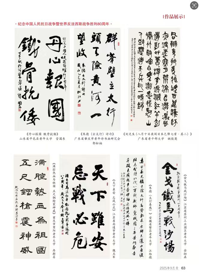 为隆重庆祝中国人民抗日战争暨世界反法西斯战争胜利80周年,大力弘扬伟大爱国主义精神与抗战精神,《老年教育.书画艺术》9月号选择全国优秀书画作品在“纪念中国人民抗日战争暨世界反法西斯战争胜利80周年”专题作品展示栏目刊登。繁昌老年大学汪维德的优秀书法作品《太行春感》得以展示,可喜可贺。