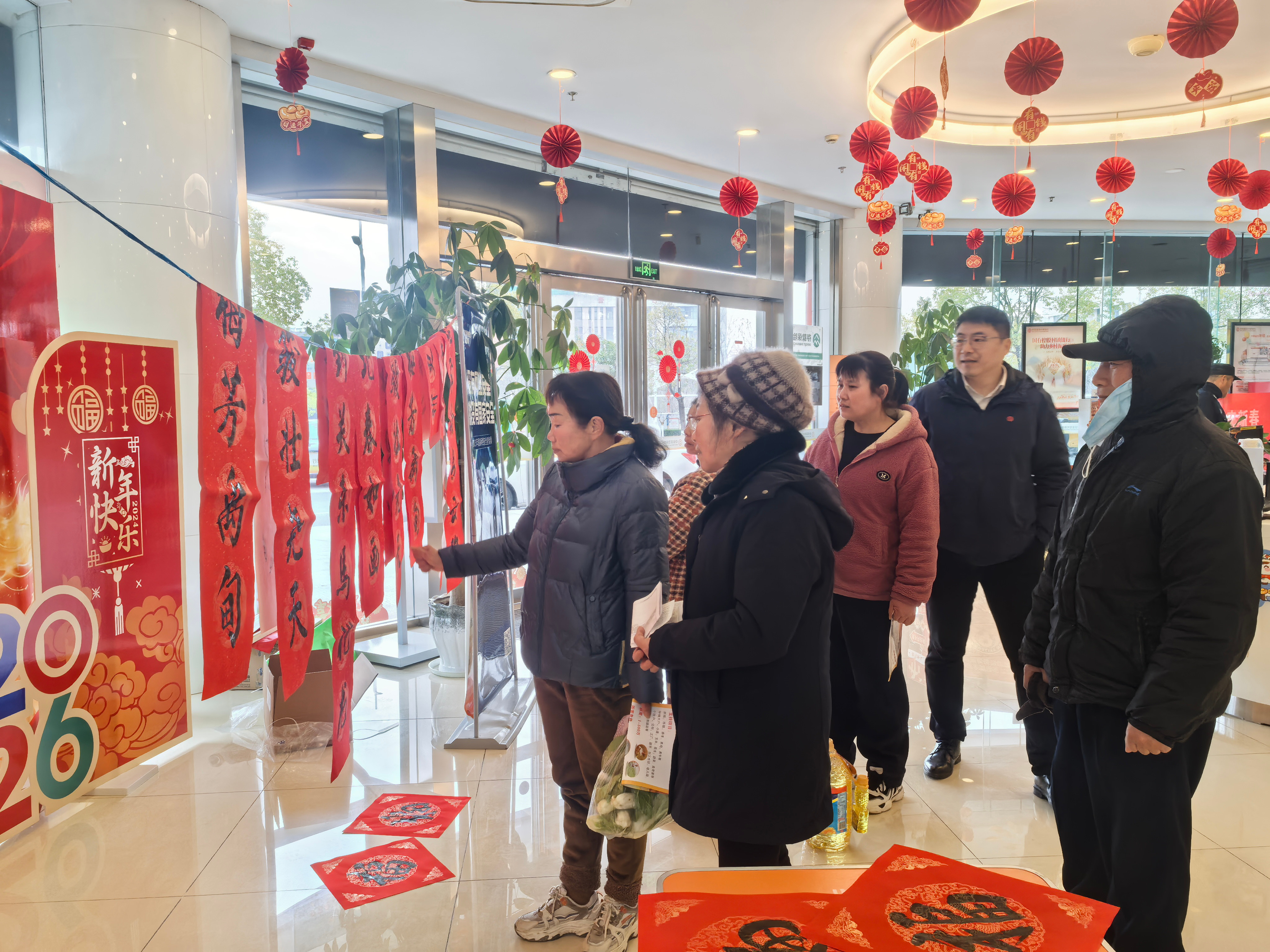 活动现场暖意融融、热闹非凡。不少年轻朋友前来定制个性化春联,师生们有求必应、悉心书写;有的年长群众分不清上下联,大家便耐心讲解、细心指导。现场居民要“福” 得福、喜获吉祥,欢声笑语不断。活动期间,银行工作人员同步开展金融知识宣传,将贴心服务融入浓浓年味,切实守护百姓钱袋子。