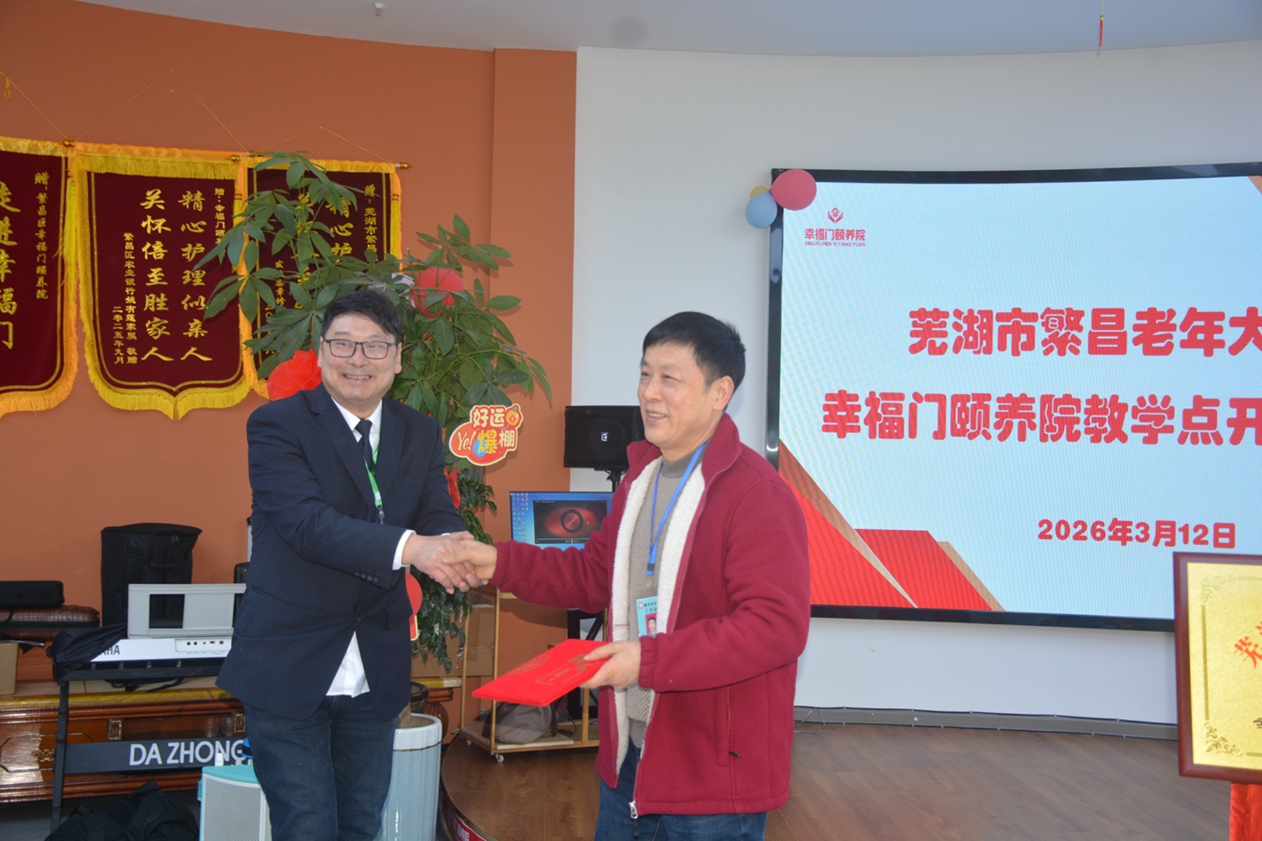 3月12日,繁昌老年大学幸福门颐养院教学点揭牌仪式暨春季开班活动在幸福门颐养院顺利举行。老年大学校长朱能雨、副校长盛茂山,区民政局副局长徐文杰,繁阳镇民政办、龙亭社区相关负责人,颐养院院长阮有梅及校方工作人员共同出席。仪式由副校长盛茂山主持。