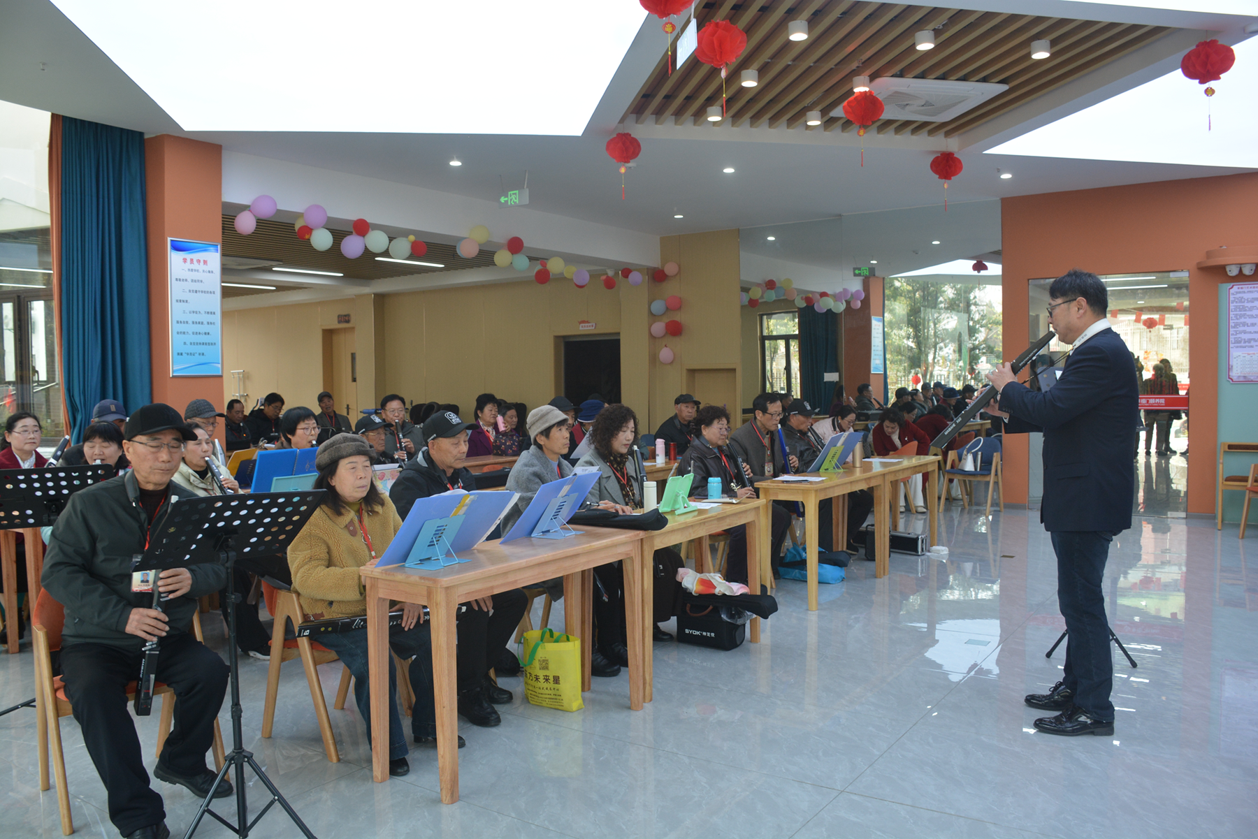 揭牌仪式后,电吹管班迎来首次授课。授课老师细致讲解基础乐理、示范吹奏技巧,手把手指导学员练习,学员们精神饱满、认真聆听、踊跃实践,课堂氛围轻松愉悦。